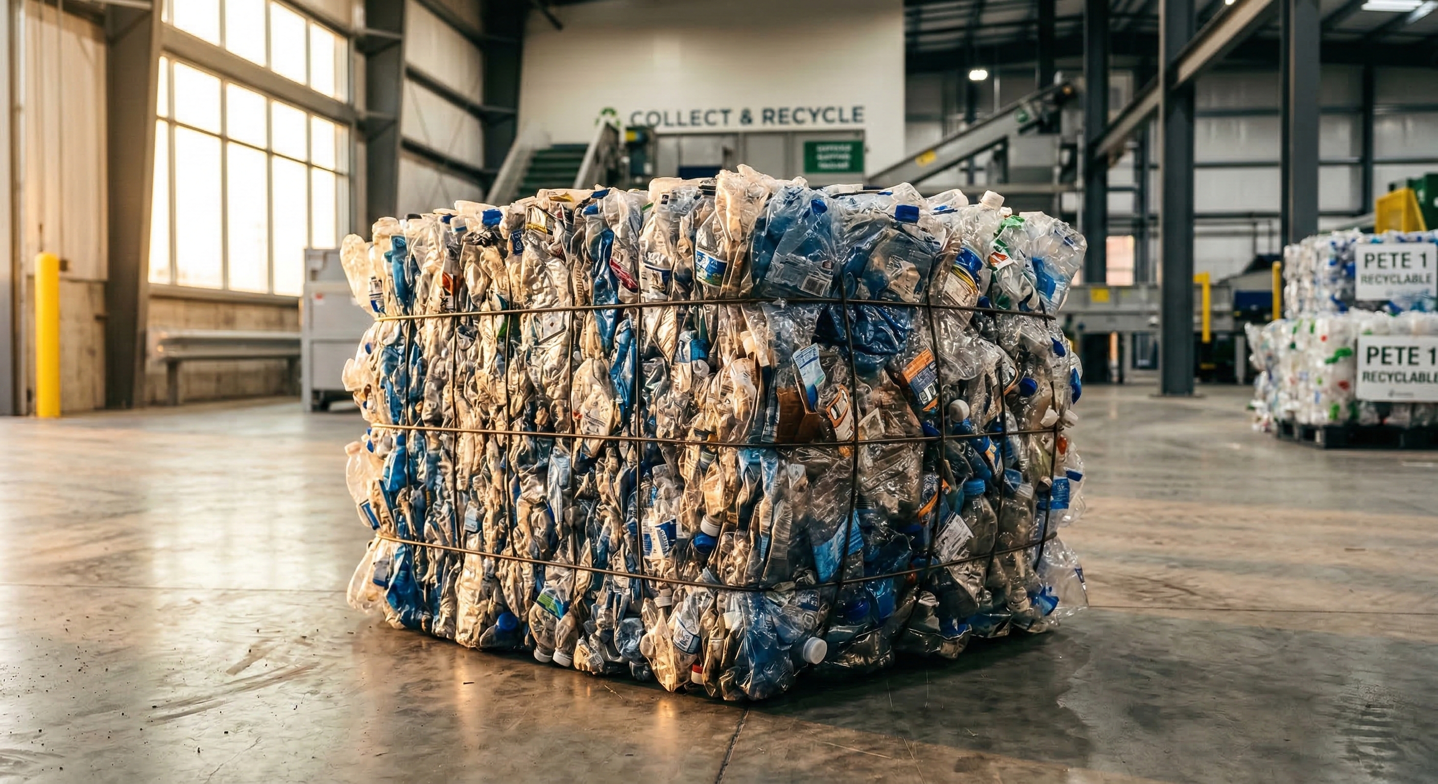 Post-consumer PET bottles are collected and sorted from recycling streams, diverting plastic waste from landfills and oceans.